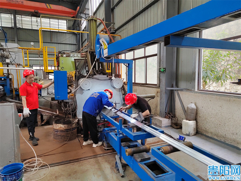 貴陽網(wǎng)·甲秀新聞訊 一根長約6米的鋁棒被叉車叉上擠壓機,通過鋁棒加熱爐軟化,再由模具擠壓之后成為成為半成品。5月10日上午,在貴州貴材創(chuàng)新科技股份有限公司擠壓車間,帶班主任韋建正在調(diào)試相關(guān)數(shù)據(jù)保障產(chǎn)品質(zhì)量。